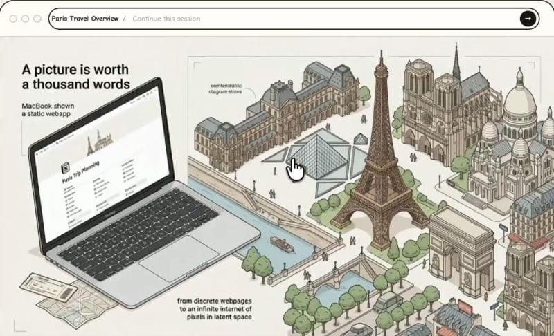 👀 What’s happening: Flipbook is a visual browser that has gone viral on X, where the internet is not organized as pages, tabs, and links. Flipbook creates the screen when you ask. Click a Paris landmark, and it generates tickets, hours, access notes, routes, and booking paths as the next visual layer.